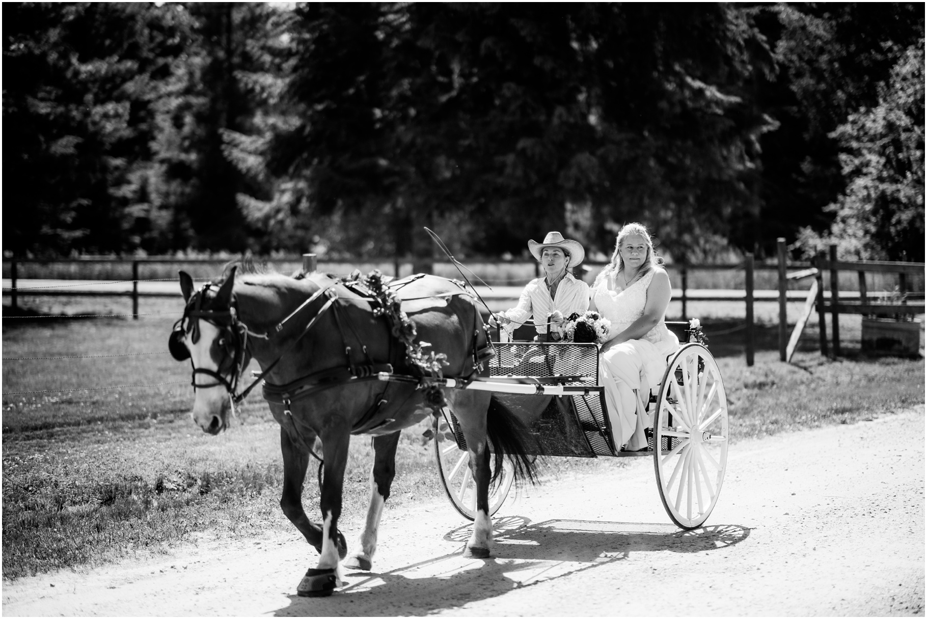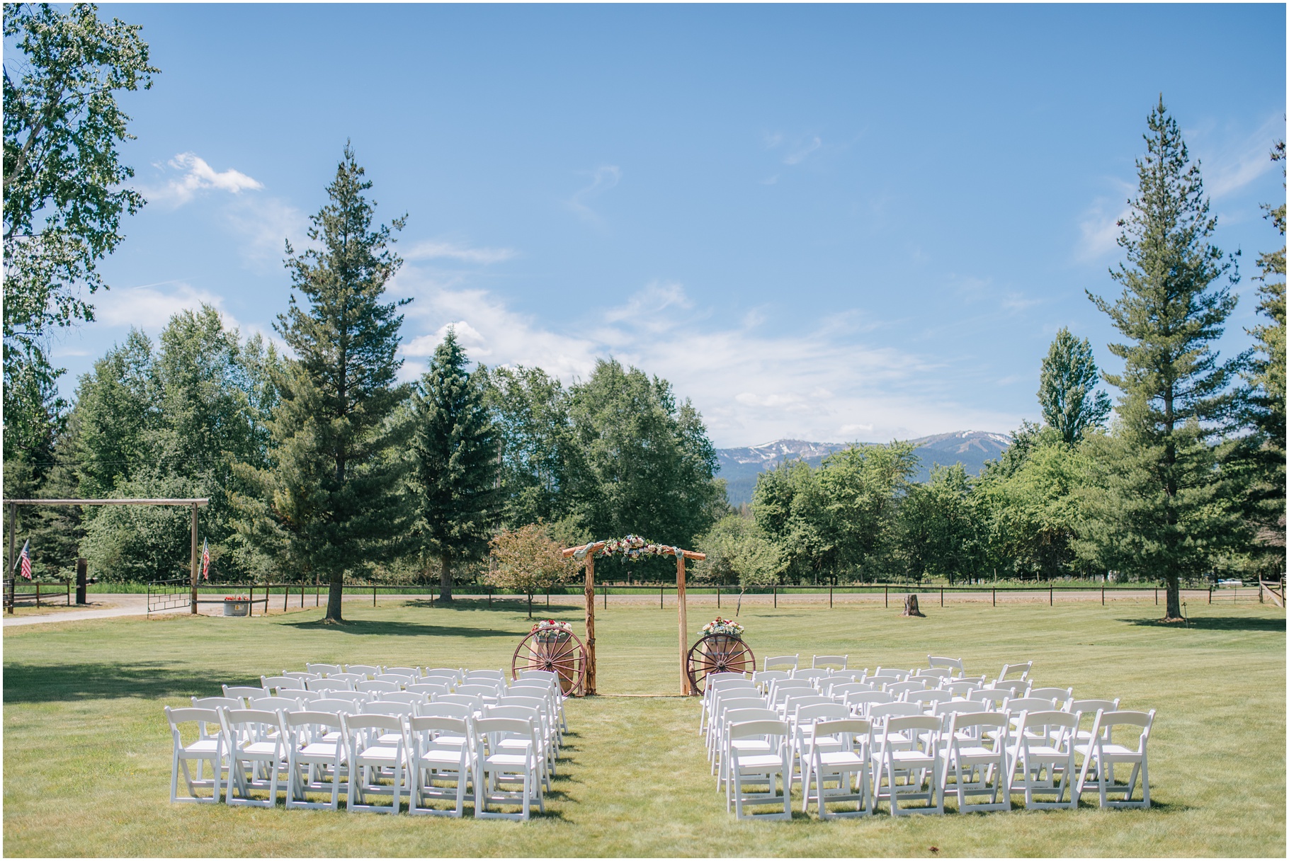 So many special, personal touches went into this wedding. It was held on family property in beautiful Selle Valley of Sandpoint, Idaho. Katie rode in on a horse-drawn carriage for her grande entrance to the ceremony. How romantic! The ceremony itself had the most gorgeous backdrop thanks to the Cabinet Mountains and perfectly blue skies.